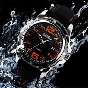 100% novo e de alta qualidade. Pulseira de silicone durável e confortável, caixa e parte traseira de aço inoxidável. Display analógico com data. Movimento preciso de quartzo para uma cronometragem precisa. 30 m (99 pés) de resistência diária à água (não para tomar banho e nadar). Características (aproximado): Diâmetro da caixa: 4,2 cm (1,65") Espessura da caixa de relógio: 1,0 cm (0,39") Comprimento da pulseira (incluída na caixa): 25,5 cm (10,04") Largura da pulseira: 2,2 cm (0,87") Peso: 75 g Material da pulseira: silicone Material da caixa: aço inoxidável