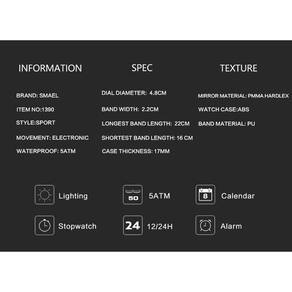 Relógio de Pulso Smael Militar Luxuoso Digital 1390 à prova d´águaMarca: SMAEL Comprimento da Pulseira: 22cm Estilo: Esporte Movimento: Duplo Profundidade de Resistência a Água: 5Bar Fecho: Fivelas Material do Invólucro: Plástico Espessura da caixa: 19mm Material: Acrílico Tipo de Item: Relógios de pulso de quartzo Material da Faixa: Plutônio Diâmetro Dial: 48mm Modelo Número: SL-1390 Largura de banda: 22mm Calendário CompletoCaracterística: Resistente a Choques Cronômetro Display de LED Data Automática À Prova D'Água Cronógrafo Luz Negra Múltiplos Fusos Horários Natação Alarme Luminosa