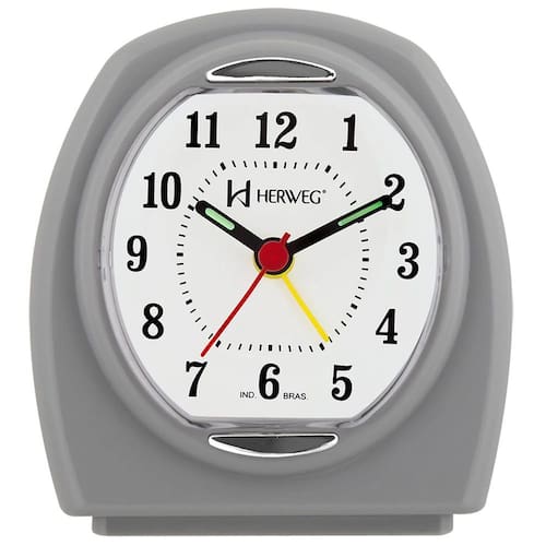 Relógio Despertador Herweg 2633-024 Tamanho: 8cm de altura X 8cm de largura X 4cm de espessura Máquinário: Step Tic-Tac Cor do fundo: Branco Cor da Estrutura: Cinza Base: Plástico pintado Vidro: Acrílico Alarme Sonoro Usa pilha AA 1 Ano de do Fabricante Ean: 7897280310096