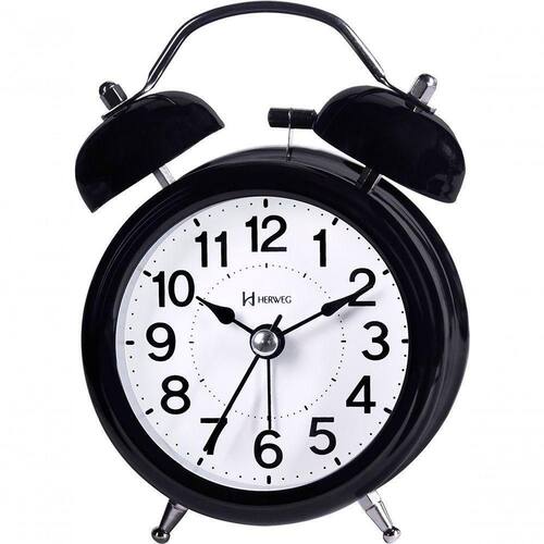 Relógio Despertador Herweg Quartz Preto 2707-034 único Relógio Despertador Herweg Quartz Preto 2707-021 único - Características Gerais do Produto: Acabamento / funcionalidades: Preto Alimentação: Pilha AA ( não inclusa) Funcionalidade: Iluminação Noturna; Mecanismo Step ( Tic Tac ); Quartz; Alarme Sonoro Material: Metal pintado; Visor de Acrílico Medidas: A: 12,5 x L: 8,7 x P: 4,6 cm Observações: Botões de regulagem na parte traseira Modelo referência do produto: 2707-034 Acompanha o produto: 01 Relógio Despertador Eletrônica Garantia de 12 meses do Fabricante Embalagem Manual de Instruções Garantia: 12 Meses de Garantia de