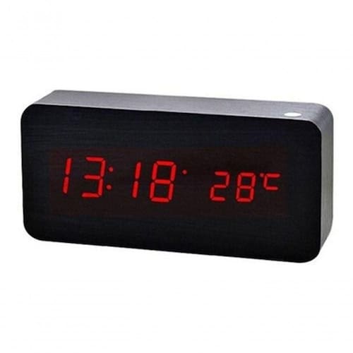 Relógio de mesa com design tipo madeira em 4 lindos modelos. Apresenta dígitos grandes para fácil visualização, Possuí a Função Voice Control, basta bater palma ou tocar no aparelho que as horas aparecem no visor.