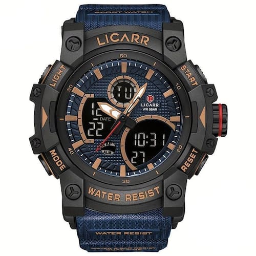 Não é apenas um acessório, é uma afirmação de estilo e funcionalidade para aqueles que lideram um estilo de vida ativo. Equipado com um robusto design esportivo, combina perfeitamente com um visual casual e moderno. Seu mostrador de exibição dupla, em detalhes ousados de preto e vermelho, é atraente e altamente funcional. Seja conquistando novos objetivos de tempo com seu cronómetro preciso, ou simplesmente mantendo-se atualizado com a função de data, este relógio está preparado para qualquer desafio diário.