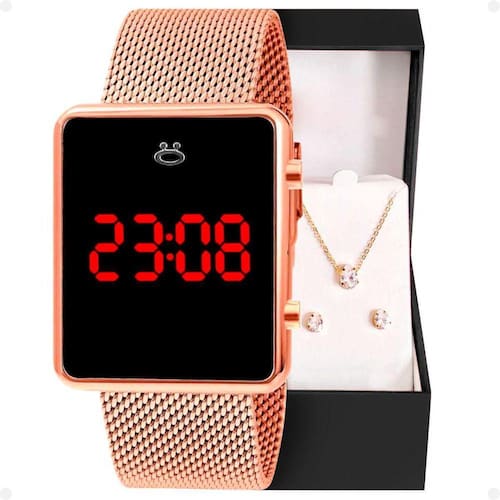 Relogio digital aço inox feminino brincos colar caixa silicone social rose quadrado banhado Kit de presente orizom maria: relógio feminino digital e colar com pingente de strass em caixa exclusiva