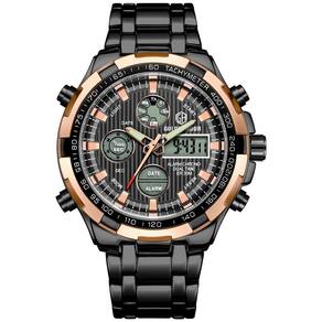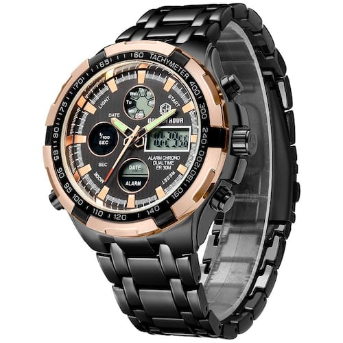 * Design esportivo moderno, pulseira de aço inoxidável e caixa de liga metálica.