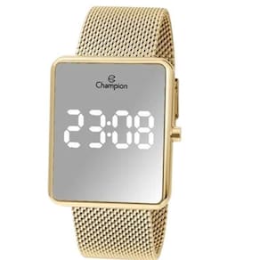 - Marca: Champion - Gênero: Feminino - Mecanismo: Digital - Alimentação: Bateria - Composição do Vidro: Cristal Mineral - Material da Caixa: Metal - Material da Pulseira: Aço inoxidável - Tampa Fundo: Rosqueado - Largura da Caixa: 4,3 cm - Altura da Caixa: 3,7 cm - Espessura da Caixa: 1,0 cm - Resistência à Água: 30 metros - Prazo de Garantia: 12 meses (Rede de autorizadas)