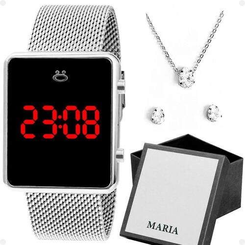 Relogio digital feminino prata + brincos + caixa + colar casual presente quadrado social silicone Kit Presente Orizom Maria - Relógio Feminino Digital e Acessórios em Aço Inoxidável