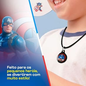 - Colar Infantil: Feito com material elástico resistente e ajustável, este colar apresenta diversos modelos com o tema do Capitão América, sempre com designs exclusivos do personagem.