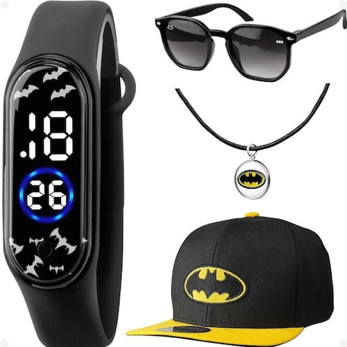 Este kit temático do Batman é perfeito para os pequenos fãs do herói. Composto por um relógio resistente à água, um colar elástico confortável, um pingente com o símbolo do Batman, um par de óculos de sol com proteção UV e um boné temático premium, este conjunto é ideal para presentear e complementar o visual das crianças.