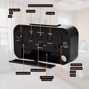 Funções: hora 12/24, despertador, data dia/mes/ano, temperatura e timer, 7 opções de toques despertador.