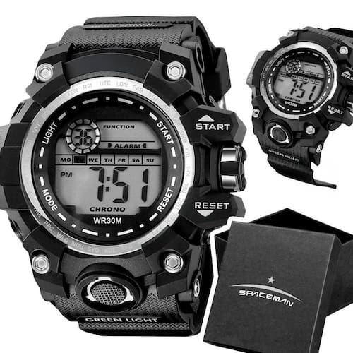 Características do produto: - Relógio digital masculino Orizom, modelo Spaceman - Cor: todo preto com detalhes em prata, proporcionando um visual moderno e versátil - À prova d'água, ideal para esportes aquáticos leves e atividades ao ar livre - Funções de luz de LED, cronômetro e alarme para maior praticidade - Pulseira em silicone ajustável para máximo conforto e adaptabilidade - Design resistente e moderno, perfeito para quem busca durabilidade e estilo