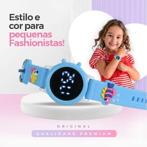 O relógio digital possui formato redondo e pulseira de silicone ajustável, garantindo conforto em qualquer tamanho de pulso infantil. A pulseira colorida é feita de elástico com pingentinhos redondos, ideal para compor o look.