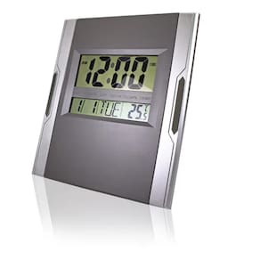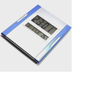 Relógio de parede ou mesa digital com temperatura, alarme e calendário.