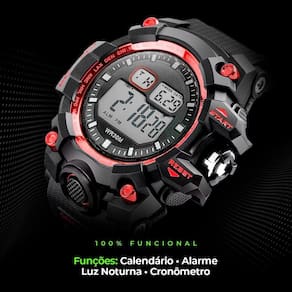 Características Principais: - Cor: Preto, com detalhes em vermelho, proporcionando um contraste marcante. - Prova D'água: Desenvolvido para resistir a adversidades da água, garantindo versatilidade e durabilidade. - Alarme: Um recurso prático para manter-se pontual e organizado. - Calendário e Data: Mantenha-se atualizado com a data e o calendário, adicionando uma camada extra de funcionalidade. - Relógio 100% Funcional: Um parceiro confiável para todas as ocasiões, combinando estilo e praticidade.