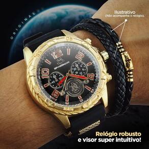 Relogio dourado masculino + cordão crucifixo presente preto Kit Exclusivo - Relógio Orizom Spaceman + Corrente + Pingente + Pulseira Grumet Este kit exclusivo combina estilo, funcionalidade e significado em um conjunto perfeito. Não perca a chance de garantir o seu