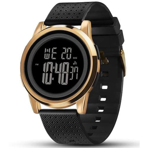 - Funções simples e fáceis de operar, com à prova d'água, interruptor de 12/24 horas, despertador, alarme de hora em hora e alarme diário, data automática, cronômetro, luz LED