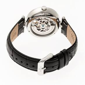 Mostrador prateado (coração aberto) (conjunto de cristal) aprimorado por ponteiros luminosos prateados. Caixa de aço inoxidável prateado com uma pulseira de couro preta (em relevo croco). Movimento automático. Resistência à água até 30 metros. Bisel fixo. Cristal mineral revestido de safira. Parte traseira transparente. Fecho de pino. Coroa de puxar/empurrar. Tamanho da caixa: 39 mm x 11 mm. Pulseira de 16 mm x de comprimento. Relógio Empress EM2101 Stella.