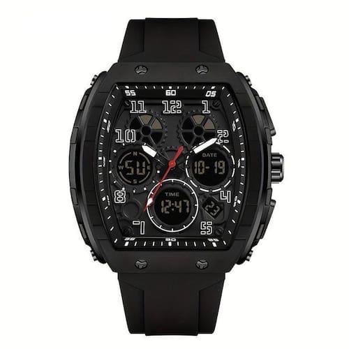 Características Principais [Material Resistente]: A pulseira de gel de sílica e a caixa de liga de zinco garantem durabilidade e conforto excepcionais, tornando-o ideal para o dia a dia. [Dupla Exibição]: Desfrute da praticidade do formato digital com a sofisticação do analógico, criando um mix perfeito para sua rotina. [Totalmente à Prova d'Água]: Com resistência de até 50m, este relógio não te deixa na mão, seja na chuva, seja nas atividades aquáticas mais dinâmicas. [Funcionalidades Práticas]: Cronômetro e alarme que facilitam sua vida ao manter você sempre no controle do tempo e das suas atividades. [Design Esportivo]: Nessa vibe de esporte urbano, o design moderno do relógio complementa o estilo desportivo sem esforço.