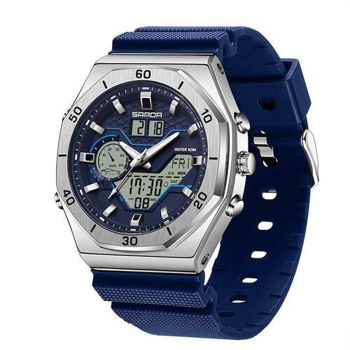 Este relógio esportivo é pura tendência para quem não abre mão do estilo e da funcionalidade. Com a elegância da face dupla que combina o digital e analógico, este acessório é o equilíbrio perfeito entre clássico e moderno. Não importa se você está na academia, na reunião ou curtindo uma balada, ele é o match perfeito para qualquer rolê. Além de ser elegante, é também resistente à água com nível de 5 ATM, garantindo que você pode se molhar sem . Seu design robusto é devido à caixa de liga de e uma pulseira de TPU, que trazem a durabilidade e o conforto que você precisa no seu dia a dia.