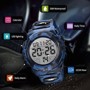 - Multifuncional: mostrador digital, calendário, luz traseira de LED, data, alarme, impermeável a 50 m, resistente a choques, cronômetro, 12/24 horas. Que relógio esportivo perfeito para esportes ao ar livre e internos