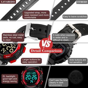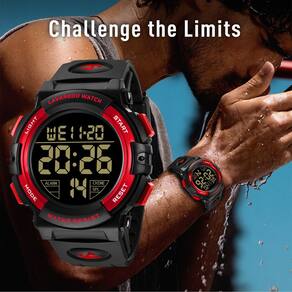 Product Description Main features: Mens Digital Sport Watch Equipped with alarm, calendar, day, date and stopwatch function. 12/24 hours. See the time clearly in the dark with backlight, easy to read. High quality silicone band, soft and comfortable to wear. 5ATM waterproof, convenient for everyday use. Metal buckle, adjustable straps. Material: Movement: Digital sports watch, waterproof. Wristband: High quality silicone resin band provides a comfortable wearing experience. Mirror surface: highly transparent resin glass, scratch resistant. Case: imported PC case. Button: stainless steel Bottom cover: high quality stainless steel, waterproof. Parameters: Dial diameter: 50 mm. Dial thickness: 17 mm. Band Length: 270mm Band width: 20 mm. Box contents: 1 x sports watch. 1 x User Manual 1 x gift. 1 x watch box. About waterproof watches: Waterproof resistance is tested under static conditions. Wearing a watch that is 50 meters waterproof, the watch will be exposed to much greater pressure than a 50 metre static test. Therefore, the number of metres on the watch does not indicate the depth to which the watch can be taken. These watches can withstand small splashes of water, but should not be worn when washing hands or immersing hands in water. Please do not pull out the buttons underwater, frequent contact with water would reduce the life of the watch. Clean the watch with a soft cloth and wipe it gently. - Relógio digital masculino: função de relógio multifuncional, hora, data, cronômetro, despertador, modo luminoso, relógio 12/24 horas, à prova de choque, atende às necessidades diárias dos homens esportivos para relógios - Relógio esportivo militar: mostrador digital, além de movimento atualizado preciso, design à prova de choque, cinto respirável para absorção de suor, mostrador grande, para fornecer garantia de qualidade para atividades militares ao ar livre - Qualidade confiável: pulseira de resina alemã confortável e ajustável, espelho de relógio de acrílico, caixa de relógio durável e peças de aço inoxidável rígido, é um ótimo presente para homens - À prova d'água: relógio de pulso à prova d'água de 50 m, uso diário à prova d'água, respingos, chuva, resistente à lavagem à mão, chuveiro, sem problemas. Exceto sauna, banho, mergulho e não puxe o botão debaixo d'água - Serviço pós-venda: se você tiver alguma dúvida sobre este relógio, sinta-se à vontade para entrar em contato com o vendedor, nós lhe daremos uma solução satisfatória