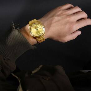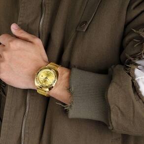 A sua resistência à água o torna ideal para o uso diário, sem precisar de preocupações com respingos ou exposição a umidade. Este modelo apresenta um formato clássico com um toque moderno, evidenciado por um mostrador bem delineado e marcadores árabes, proporcionando uma leitura fácil e rápida. Com cada detalhe foi projetado para homens que valorizam a interseção entre moda e funcionalidade.