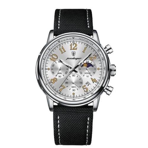 Especificações [Design Moderno]: O mostrador apresenta marcadores de algarismos arábicos que conferem um toque contemporâneo e fácil leitura, ideal para o cotidiano agitado. [Durabilidade Excepcional]: Com espessura de 13mm e um estojo feito em aço inoxidável, este relógio é construído para durar e resistir a desafios. [Funcionalidades Avançadas]: Equipado com cronógrafo, mãos luminosas e data automática, este relógio é mais que um acessório; é um gadget indispensável. [Resistência à Água]: Com resistência de até 3 Bar, este relógio é um verdadeiro companheiro em atividades aquáticas, seja na piscina ou no mar. [Estilo Incomparável]: Feito com pulseira de náilon de alta qualidade, proporciona uma estética esportiva enquanto mantém o conforto e a durabilidade.