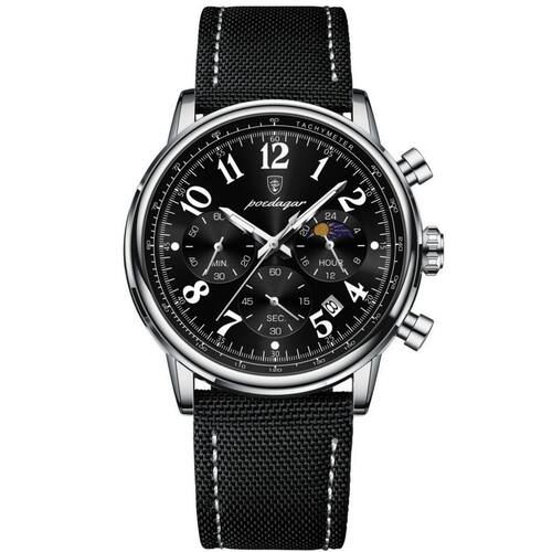 Especificações [Design Moderno]: O mostrador apresenta marcadores de algarismos arábicos que conferem um toque contemporâneo e fácil leitura, ideal para o cotidiano agitado.[Durabilidade Excepcional]: Com espessura de 13mm e um estojo feito em aço inoxidável, este relógio é construído para durar e resistir a desafios.[Funcionalidades Avançadas]: Equipado com cronógrafo, mãos luminosas e data automática, este relógio é mais que um acessório; é um gadget indispensável.[Resistência à Água]: Com resistência de até 3 Bar, este relógio é um verdadeiro companheiro em atividades aquáticas, seja na piscina ou no mar.[Estilo Incomparável]: Feito com pulseira de náilon de alta qualidade, proporciona uma estética esportiva enquanto mantém o conforto e a durabilidade.