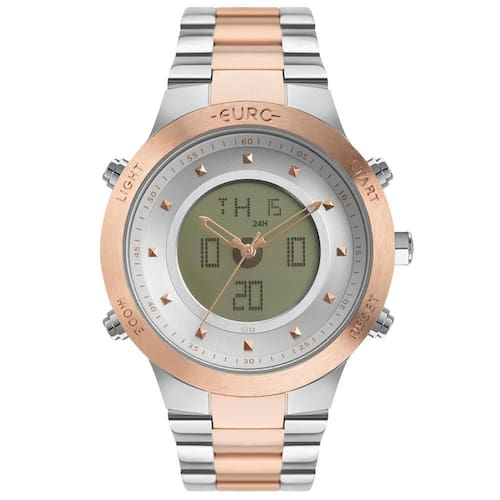 Modelo: EUBJ3889AE/4J Tamanho da caixa: 40 mm Material da caixa: Metal Material da pulseira: Aço inox Cor: Bicolor (prata e rosé) Mostrador: Analógico + Digital (funções: hora, data, dia da semana, alarme, cronômetro e luz) Vidro: Cristal mineral Resistência à água: 5 ATM (50 metros) Fecho: Dobrável com trava Alimentação: Bateria (quartzo) Estilo: Fashion / Esportivo / Casual