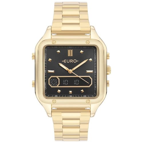 Estilo, personalidade e funcionalidade se encontram neste modelo da coleção FF Sporty da Euro. Com design moderno e ousado, ele possui caixa retangular de 41mm em metal dourado, que se destaca pelo acabamento robusto e elegante.