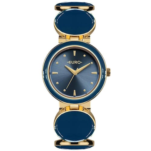Relógio Euro Feminino Ref: Eu2035ywh/4a Bracelete Dourado DESCRIÇÃO DO PRODUTO: Caixa de Metal Pulseira de Aço estilo bracelete com detalhes em azul Vidro de Cristal Mineral Fundo Pressão Resistente à Água Até 3 Atm Diâmetro / Largura da Caixa: 30.00 MM Funções: Analógico, Bracelete Mostrador azul Alimentação do Maquinário: Bateria Maquina Japonesa de 1 Ano Marca: Não Informado