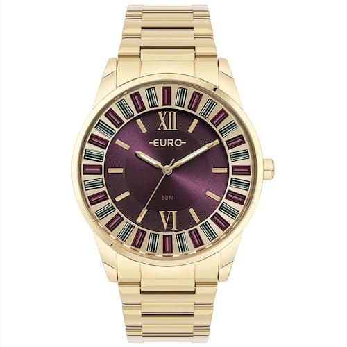 Relógio Euro Feminino Stones Dourado - Eu2035ytr/4n Eu2035ytr/4n A poderosa linha Stones traz um novo modelo diferenciado, agora com números romanos e mix de pedras baguette bicolor aplicadas por dentro do vidro do relógio, o que traz mais segurança e modernidade para quem está usando. Ideal tanto para as mulheres que querem trazer um ponto de cor e brilho para os looks do dia a dia, tanto para compor qualquer visual à noite. Produto com caixa de metal e pulseira de aço inoxidável em banho dourado, mostrador de cor roxa, tamanho de caixa 42mm e resistência à água 50m. Cor da Caixa - Dourado Formato da Caixa - Redondo Material da Pulseira - Aço Garantia - 12 meses Cor do Mostrador - Roxo Cor da Pulseira - Dourado Largura da Caixa (cm) - 4,2 Resistente a Água - 5 ATM Descrição da Resistência - A resistência deste produto permite apenas respingos de água ao lavar as mãos. Não utilizar este produto em qualquer situação que haja contato direto com água. meli_title - Relógio Euro Feminino Stones Dourado - EU2035YTR/4N Modelo_ML - Relógio Euro Feminino Stones Dourado - EU2035YTR/4N Cor - Dourado Tamanho - Grande Gênero - Feminino