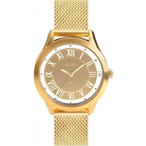 O relógio feminino Euro da coleção Ouse Ser Você mesma foi desenvolvido para celebrar o Dia Internacional da Mulher. Uma data para homenagear a força e coragem de todas as mulheres. Os modelos comemorativos trazem a transparência no mostrador e uma mensagem especial no fundo para aquelas que têm atitude e se sentem bem na própria pele! Nesse modelo temos o banho dourado na pulseira e também no mostrador. São modelos que se encaixam super bem no dia a dia da mulher Euro.