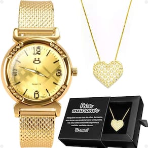 Relogio Feminino Aço Dourado + Colar Coração Amor + Caixa Inoxidável Presente Social Moda Casual Kit Presente Feminino: Relógio Orizom Maria e Colar Elegante com Pingente de Strass Surpreenda quem você ama com este magnífico kit de presente, especialmente pensado para mulheres que valorizam detalhes únicos e elegância em seus acessórios. Este conjunto inclui um relógio Orizom Maria de design exclusivo e um colar sofisticado com pingente de strass, ambos apresentados em uma caixa premium personalizada, perfeita para ocasiões especiais.