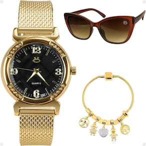 Relógio Feminino Aço Inox Banhado + Óculos de Sol + Pulseira Ajustável - Orizom Maria Kit Feminino Orizom Maria - Relógio Dourado, Óculos Gatinho e Pulseira com Pingentes Seja você uma mulher em busca de estilo, sofisticação e qualidade nos acessórios, o Kit Feminino Orizom Maria é a escolha perfeita para você Com um design moderno e elegante, este conjunto é versátil e ideal para todas as ocasiões, desde o dia a dia até eventos especiais. Além disso, é também uma excelente opção de presente para aquela pessoa especial em datas comemorativas. O que você recebe com o kit - Relógio Feminino Analógico Orizom - Modelo Maria - Dourado: Um relógio de formato redondo, com estrutura em aço inoxidável, acabamento dourado e pulseira em silicone ajustável. Com um mostrador preto e tampa traseira blindada, este relógio oferece requinte e durabilidade. - Óculos de Sol Feminino Orizom - Modelo Maria: Com design em formato gatinho, e hastes de acetato de alta qualidade, acabamento todo marrom e lentes com proteção UV. de um visual moderno e estiloso com segurança contra os raios solares. - Pulseira Feminina Banhada com Pingentes: Uma pulseira delicada e sofisticada, banhada e com detalhes variados de pingentes, trazendo elegância e brilho para qualquer look. Perfeito para diversas ocasiões Este kit é perfeito para o dia a dia, trabalho, festas e eventos sociais. Além disso, é uma excelente opção para presentear em aniversários, Dia das Mães, Dia dos Namorados e outras datas especiais. Pagamento facilitado Garanta já o seu kit e tenha um conjunto de acessórios sofisticados para compor qualquer look com estilo e requinte. Não perca essa oportunidade