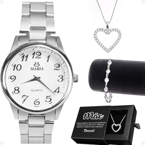 Relogio Feminino Aço Inox + Caixa Social Aço Inoxidável Strass Presente Qualidade Premium Kit Presente Orizom Maria: Relógio Feminino Analógico, Colar, Pingente e Pulseira em Prata