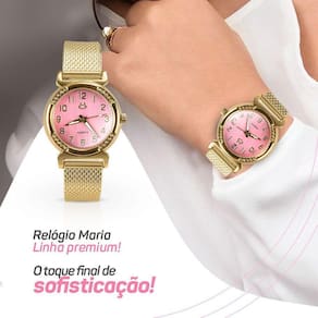 Relogio feminino aço inox dourado banhado + caixa social Adicione luxo e personalidade ao seu estilo com o Relógio Feminino Orizom Maria