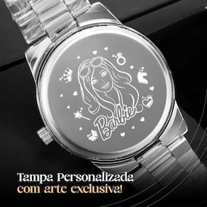 Relógio Barbie: - Design clássico e sofisticado - Cor: Prata - Material da pulseira: Aço inoxidável - Material da caixa: Aço inoxidável - Marcações: Números arábicos nos pontos 12, 3, 6 e 9 configuração de mostrador pode variar - Ponteiros: Três ponteiros horas, minutos e segundos - Logotipo da Barbie no mostrador - Fechamento: Fivela de implantação - Tamanho: Adulto/Padrão