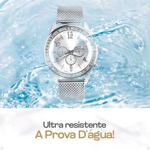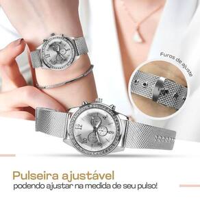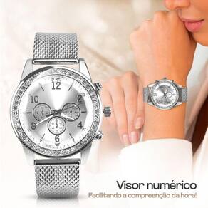 - Qualidade: Ultra Premium - Resistente à água - Maquinário: Aço inoxidável, acabamento em prata - Mostrador decorado com pedrinhas transparentes de strass - Números fáceis de ler para rápida compreensão das horas - Pulseira ajustável de silicone