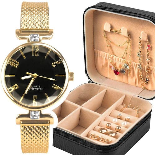 Adicione um toque de luxo ao seu visual com este kit exclusivo de acessórios elegantes. Este conjunto inclui um relógio analógico feminino dourado à prova d'água, um porta joias/relogio exclusivo, um colar em aço inoxidável banhado a ouro com pedrinha de strass, uma pulseira em aço inoxidável banhada com pingente, 5 pares de brincos em aço inoxidável banhados a ouro com diferentes formas, e um anel em aço inoxidável banhado a ouro.