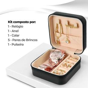 Relogio Feminino Banhado Colar Porta Joia Brincos Prova Dagua Social Casual Presente Kit de Acessórios Elegantes Banhados a Rosê Descubra o luxo e a sofisticação com este exclusivo kit de acessórios, todos meticulosamente banhados a rosê, perfeito para enriquecer seu visual com um toque de elegância e charme. Este conjunto versátil é ideal tanto para o uso diário quanto para ocasiões especiais, garantindo que você sempre tenha o acessório perfeito à mão. O conjunto inclui: 1. Relógio Analógico Feminino - Material: Aço Inoxidável - Acabamento: Banhado a rosê - Detalhes: À prova d'água, combinando estilo e funcionalidade. 2. Porta Joias/Relógio Orizom Maria Exclusivo - Design: Elegante e prático, ideal para manter seus acessórios organizados e protegidos. 3. Colar Banhado a Rosê - Detalhe: Decorado com uma pedrinha de strass, oferecendo um brilho sutil e elegante. 4. Pulseira Banhada a Rosê com Pingente - Estilo: Delicado e charmoso, perfeito para adicionar um toque especial ao seu pulso. 5. Conjunto de 5 Pares de Brincos Banhados a Rosê - Variedade: Diferentes formatos para combinar com qualquer estilo, enviados conforme disponibilidade em . 6. Anel Banhado a Rosê - Design: Simples e elegante, complementando perfeitamente os outros acessórios do conjunto. IMPORTANTE: Todos os acessórios são cuidadosamente selecionados e podem variar em desenhos e formatos, dependendo da disponibilidade em . As imagens são representativas e podem diferir dos itens exatos enviados. Ideal para: Este kit é perfeito para presentear a si mesma ou alguém especial, oferecendo uma coleção de acessórios luxuosos adequados para diversas ocasiões. Seja para um evento importante ou para elevar seu estilo no dia a dia, este conjunto garantirá que você esteja sempre no seu melhor. Adquira agora e transforme seu guarda-roupa com acessórios que irradiam beleza e sofisticação. Não perca a chance de possuir ou presentear este kit exclusivo banhado a rosê. Marca: Não Informado