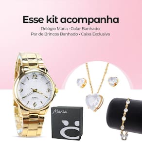 Relogio Feminino Banhado + Pulseira Caixa + Colar Aço Inox Qualidade Premim Social Casual Arrase no estilo com este kit incrível! Relógio analógico feminino banhado a 18k, à prova d\'água e feito em aço inoxidável para durabilidade e elegância no dia a dia. Combine com o colar banhado em strass transparente para um toque de brilho sutil e sofisticado, e complemente com o par de brincos banhados com pedrinhas de strass para qualquer ocasião. E para finalizar, a pulseira banhada com vários strass transparentes adiciona um glamour irresistível ao conjunto. E ainda vem com uma caixa Orizom Maria Premium para garantir que seu presente seja ainda mais especial. Não perca essa oportunidade de presentear com estilo e sofisticação!