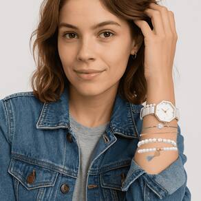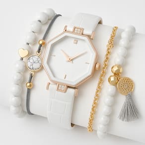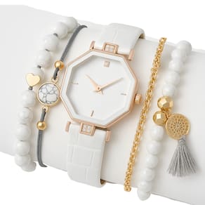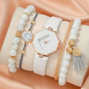 Descubra o charme e a praticidade do nosso Kit de Relógios e Pulseiras! Combinando funcionalidade e estilo, o relógio garante pontualidade com um design moderno, enquanto as pulseiras complementam com elegância e sofisticação. Ideal para elevar qualquer look, é a escolha perfeita para presentear ou se mimar. Material: Aço inoxidávelPulseira: CouroCor: Dourado e brancoComprimento do relógio: Aproximadamente 24 cmNão acompanha caixaNão é a prova d'água