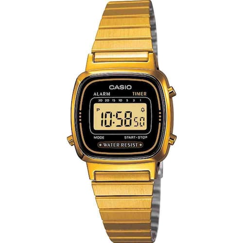 Relógio Casio LA670WGA-1DF dourado, com caixa em aço inoxidável com fundo de pressão e pulseira também em aço. A caixa mede 2,5cm de largura e 3cm de altura e a pulseira mede 18cm de largura. O Relógio é digital, resistente à água em até 3atm, tem visor com iluminador de led, cronômetro e alarme. O Relógio Casio LA670WGA-1DF é ideal para complementar looks durante o dia. Acompanha garantia de um ano pelo fabricante.