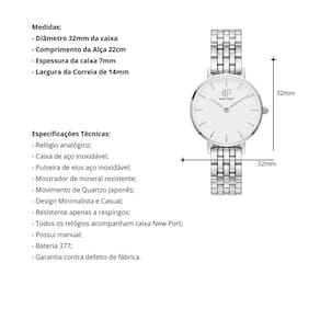 Descubra o Relógio Feminino Nápole Silver da New Port, um ícone de sofisticação e elegância. Sua pulseira de elos em aço inoxidável dourado, combina com um mostrador branco deslumbrante e protegido por vidro mineral endurecido, não apenas captura a luz com um brilho irresistível, mas também garante durabilidade e resistência excepcionais. Com um diâmetro de 32mm e uma caixa de metal dourado, este relógio é mais do que um acessório, é uma afirmação de estilo. Perfeito para qualquer ocasião, desde encontros casuais até eventos sofisticados, o Nápole Silver é a escolha ideal para mulheres de estilo e atitude. Eleve eu visual com uma peça que transcende tendência e mantém seu charme atemporal. A pulseira é de fácil ajuste e se adapta bem a todos os pulsos. Medidas: - Diâmetro 32mm da caixa - Comprimento da Alça 21cm - Espessura da caixa 10mm - Largura da Correia de 15mm