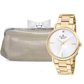 Principais características: - Kit Relógio Feminino Champion Cn25896G + Bolsa Nude - Relógio analógico com caixa e pulseira douradas - Material da caixa: Metal - Material da pulseira: Aço - Material da bolsa: Sintética - Cor da bolsa: Nude - Resistência à água: 5 ATM - Kit Contém: 1 Relógio e 1 Bolsa sintética - Dimensões da Embalagem: Altura: 5cm, Largura: 26cm, Profundidade: 16cm - Peso: 0,350Kg - Garantia: 12 Meses