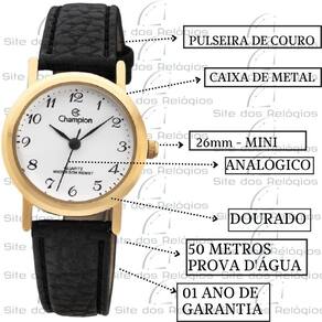 Descricão do Relógio Marca - Champion Modelo - CH25016M Genero - Feminino Mostrador - Branco Caixa - Dourado Mecanismo - Analógico Calendário - Não Coroa - Simples Fundo - Rosqueado Resistência à Água - 50 Metros (Lavar a Mão / Chuva / Piscina) Vidro - Cristal Mineral Material da Caixa - Metal Material da Pulseira - Couro Diâmetro da Caixa - 26 mm Diâmetro do Visor - 22 mm Espessura da Caixa - 9 mm Largura da Pulseira - 14 mm Trava Pulseira - Fivela Comprimento da Pulseira - 20 cm Peso - 20 gramas Fabricante - Magnum Industria da Amazônia LTDA Garantia - Garantia de 1 Ano direto com Fabricante Conteúdo da embalagem: 01 Relógio de pulso 01 Estojo Autêntico Manual em português Certificado de Garantia do Fabricante Nota Fiscal Eletrônica
