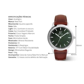 Medidas: - Diâmetro: 40mm- Espessura da Caixa: 07mm- Comprimento da Alça: 24cm- Largura da Alça: 20mm ESPECIFICAÇÕES TÉCNICAS - Visor: Analógico - Marca: New Port - Movimento: Quartzo Japonês - Data: Não - Light: Sim, iluminam no escuro - Caixa: Aço Inoxidável Prateado - Pulseira: Couro Vegano Marrom - Fecho: Fivela Simples - Face: Minimalista Verde - Mostrador: Mineral Resistente - Ponteiros: 03 - Resistente: A Respingos - Bateria: 377 Com Maior Durabilidade - Design: Minimalista Elegante - Peso: 104g - Categoria: Relógio Feminino - Acompanha: Caixa da marca New Port e Manual- Garantia: 12 meses contra defeito de fabricação Após a confirmação de compra, o código de rastreio será enviado em até um dia útil em seu e-mail. Marca: Não Informado