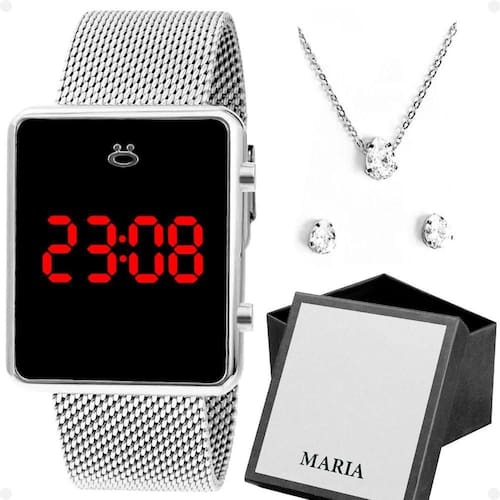 Relogio Feminino Digital Aço Inox + Brincos + Caixa + Colar Qualidade Premium Social Presente Casual Kit Presente Orizom Maria - Relógio Feminino Digital e Acessórios em Aço Inoxidável Este elegante kit Orizom Maria é o presente ideal para quem valoriza acessórios sofisticados e duráveis. Com um relógio digital prateado e um conjunto de acessórios em aço inoxidável, este kit é perfeito para ocasiões especiais ou para elevar o estilo diário.