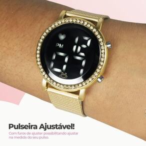 Características: - Relógio Orizom Maria: Design dourado com detalhes em strass para um toque de glamour. Caixa em aço inox banhado. Pulseira em silicone ajustável para maior conforto. Diâmetro aproximado de 4cm.