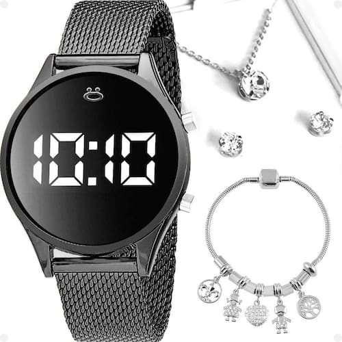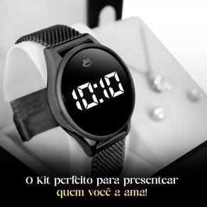 Relogio Feminino Digital Aço Preto + Brincos + Caixa + Colar Kit Feminino Orizom Maria - Relógio Digital e Conjunto de Joias em Aço Inoxidável Adquira já o elegante Kit Feminino Orizom Maria, composto por um Relógio Digital, Colar, Pingente, Par de Brincos e uma Pulseira Estilo Pandora, todos em aço inoxidável.